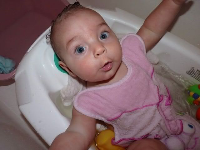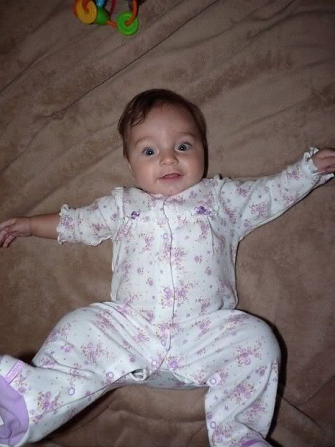 Then, when we got home I noticed that she was cutting her first tooth! I couldn't believe it, seems so early for that! She was very cranky on Monday and everybody could tell she didn't feel good. The next day she was back to her old self though, so apparently that was the worst of it. No more letting her gnaw on my finger like she used to...that little tooth is sharp! I wish I had a picture of it, but its on the bottom and very hard to get a glimpse of with her tongue in the way.